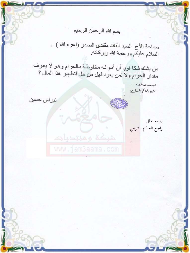 الشك بالاموال انها مخلوطة بالحرام(استفتاء للسيد القائد بتاريخ 24-3-2011)