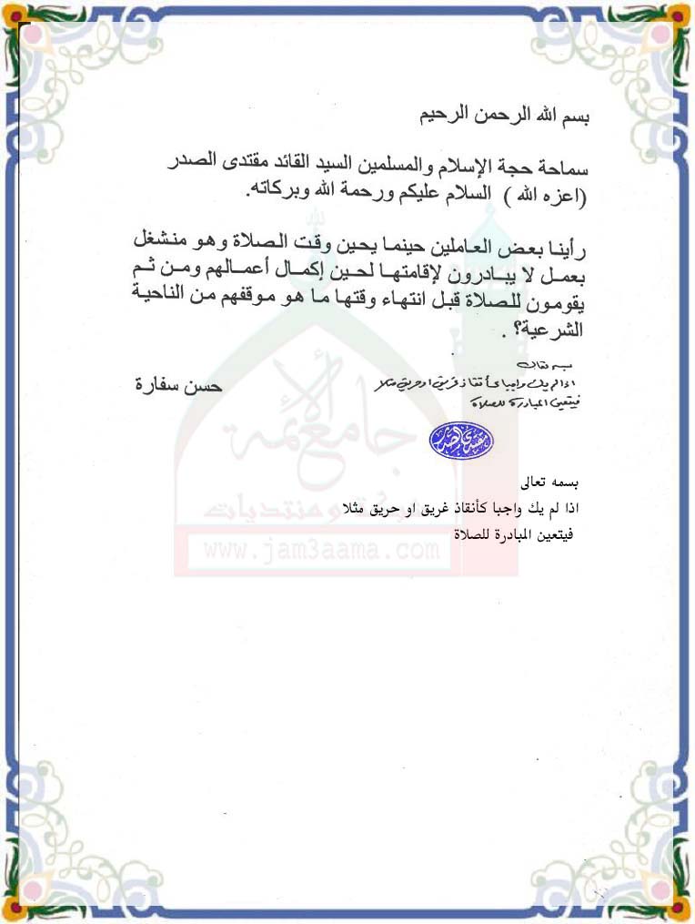 حكم الصلاة مع التزاحم(استفتاء للسيد القائد بتاريخ 24-3-2011)