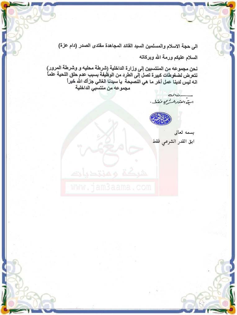 الضغوطات على المنتسبين الامنيين بحلق اللحية(استفتاء للسيد القائد بتاريخ 24-3-2011)