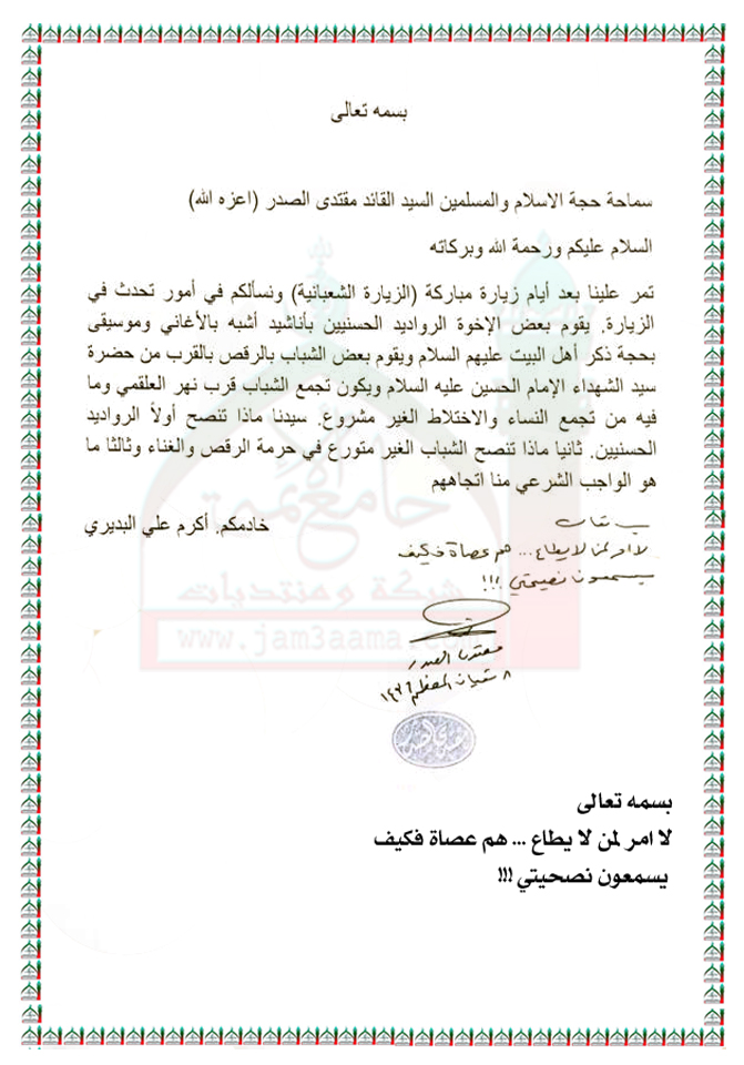 الزيارة الشعبانية وما يرافقها من اناشيد تشبه الاغاني وموسيقى من قبل الشباب الغير منضبط استفتاء سماحة السيد القائد مقتدى الصدر ( اعزه الله ) 27 - 5 - 2015