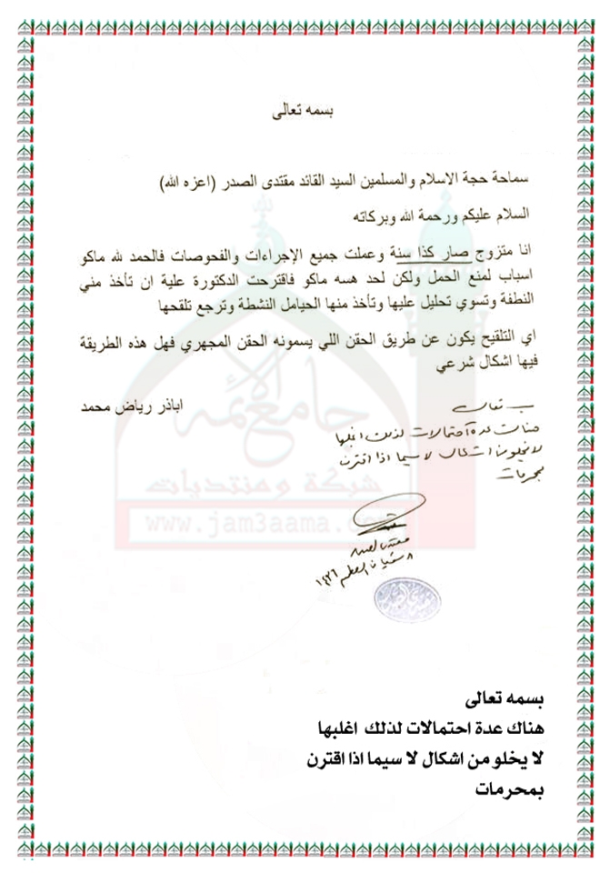 الحقن المجهري لغرض الحمل استفتاء سماحة السيد القائد مقتدى الصدر ( اعزه الله ) 27 - 5 - 2015