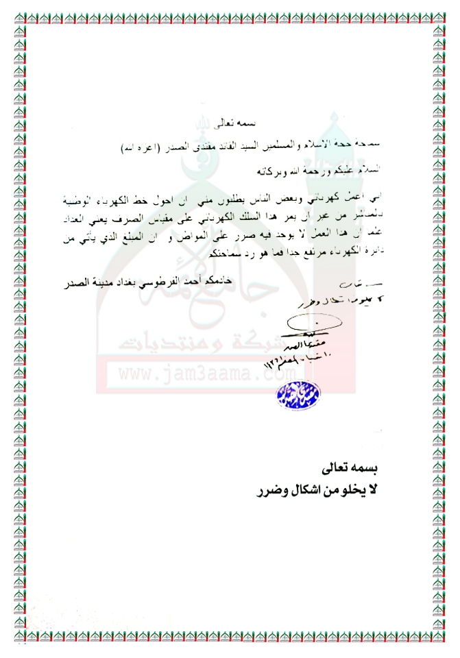 تحويل خط التيار الكهربائي من دون المرور بمقياس الصرف استفتاء السيد القائد مقتدى الصدر اعزه الله 30 - 5 - 2015