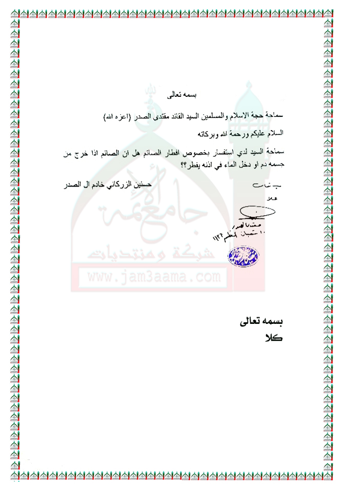 خروج الدم من الجسم ودخول الماء في اذن الصائم استفتاء السيد القائد مقتدى الصدر اعزه الله 30 - 5 - 2015