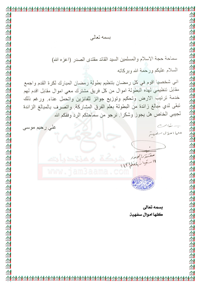 شخص يجمع اموال من فرق رياضية لاقامة بطولات في شهر رمضان المبارك ويتصرف بالفائض منها لحسابه الخاص استفتاء سماحة السيد القائد مقتدى الصدر ( اعزه الله ) 30 - 5 - 2015