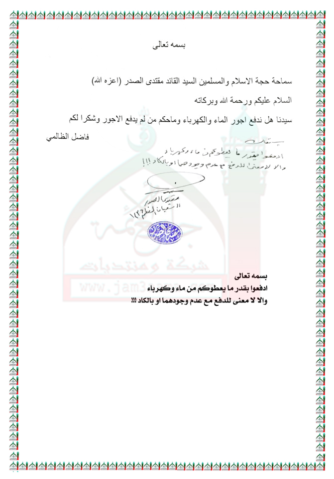 دفع اجور الماء والكهرباء استفتاء سماحة السيد القائد مقتدى الصدر ( اعزه الله ) 30 - 5 - 2015