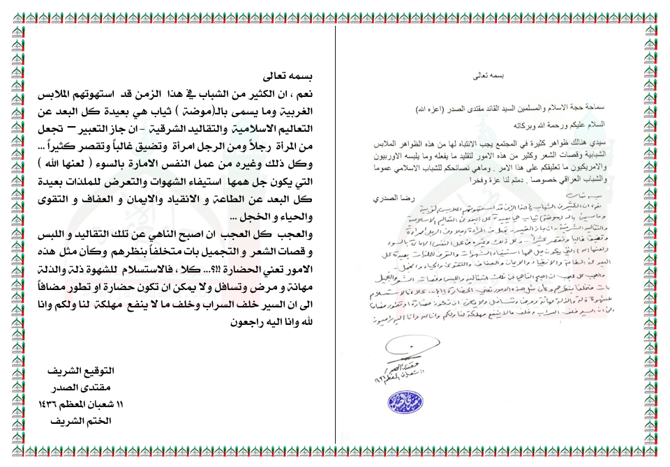 تقليد الغرب في الملابس وقصات الشعر بالنسبة للشباب استفتاء سماحة السيد القائد مقتدى الصدر ( اعزه الله ) 30 - 5 - 2015