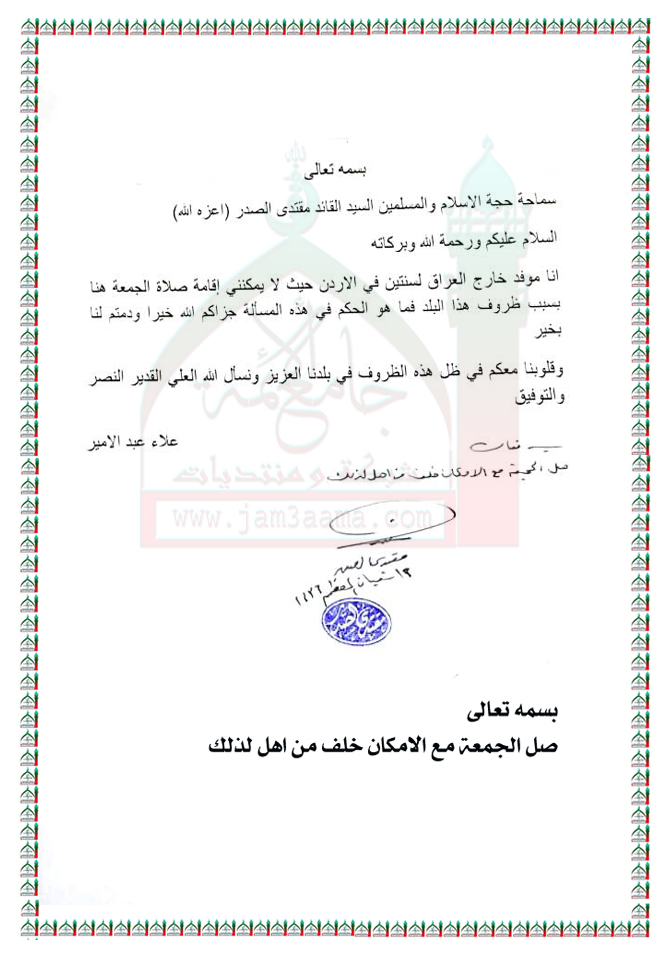 أحد الاشخاص موفد خارج العراق لا يمكنه اداء صلاة الجمعة استفتاء السيد القائد مقتدى الصدر اعزه الله 31 - 5 - 2015