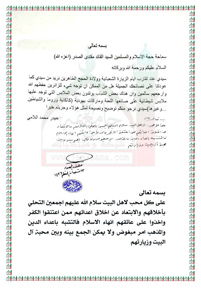 نصائح للزائرين الشباب الذين يرتدون ملابس تحمل بعض العبارات والعلامات التي تنافي الخلق الاسلامي استفتاء السيد القائد مقتدى الصدر اعزه الله 1 - 6 - 2015