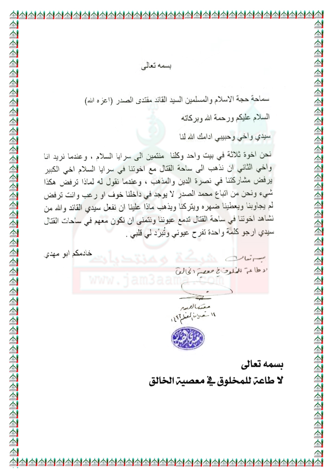 معارضة اخ لاخويه من المشاركة في القتال مع سرايا السلام استفتاء سماحة السيد القائد مقتدى الصدر ( اعزه الله ) 2 - 6 - 2015