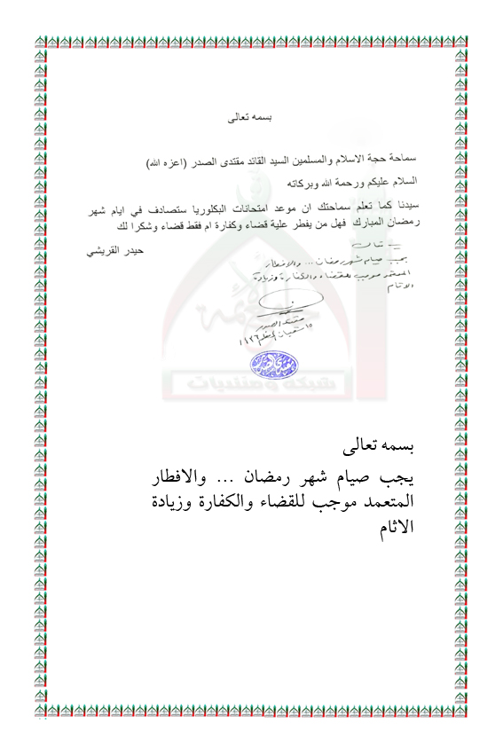 صيام شهر رمضان المبارك من قبل الطلبة الذي سيصادف امتحانات البكلوريا فيه استفتاء السيد القائد مقتدى الصدر اعزه الله 3 - 6 - 2015
