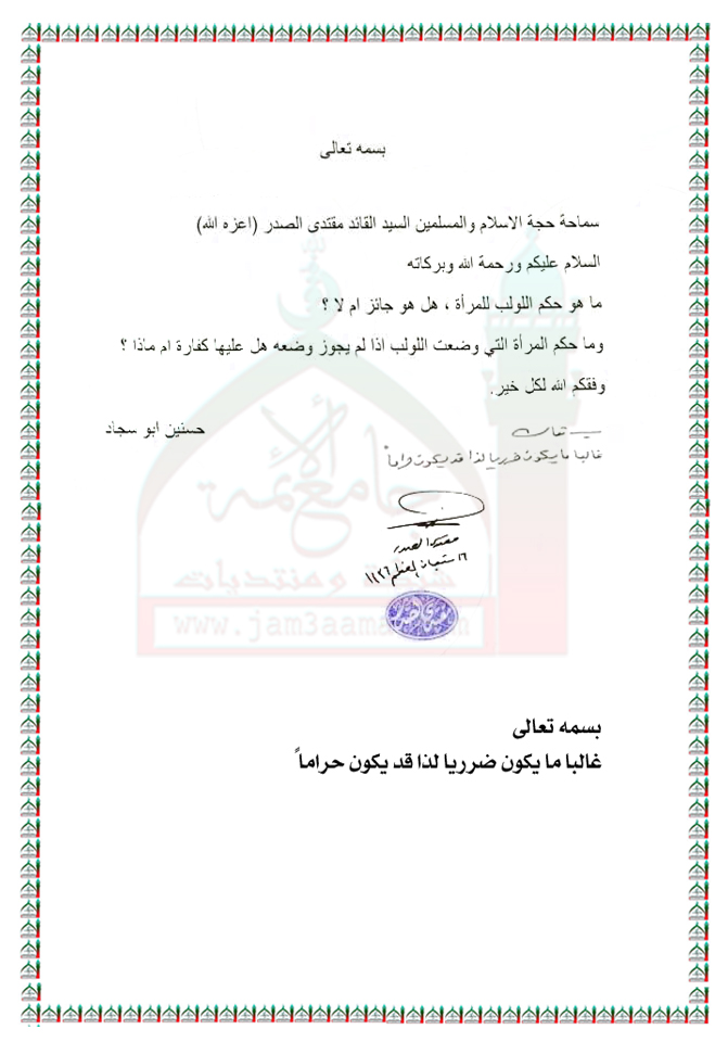 وضع اللولب لمنع الحمل استفتاء سماحة السيد القائد مقتدى الصدر ( اعزه الله ) 4 - 6 - 2015