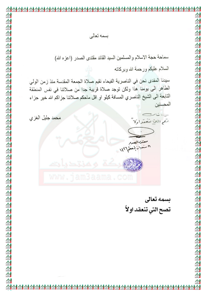 مزاحمة احدى صلوات الجمع لصلاة جمعة منعقدة منذ زمن السيد الشهيد محمد محمد صادق الصدر(قدس) استفتاء سماحة السيد القائد مقتدى الصدر ( اعزه الله ) 4 - 6 - 2015