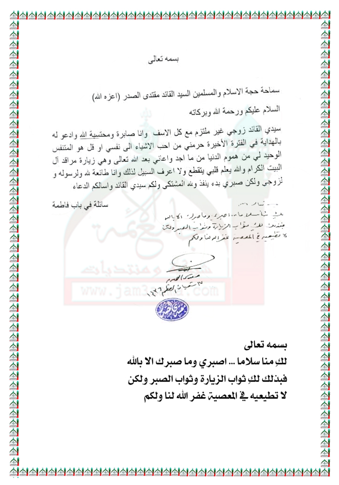 منع الزوج لزوجته من زيارة مراقد اهل البيت عليهم السلام استفتاء سماحة السيد القائد مقتدى الصدر ( اعزه الله ) 5 - 6 - 2015
