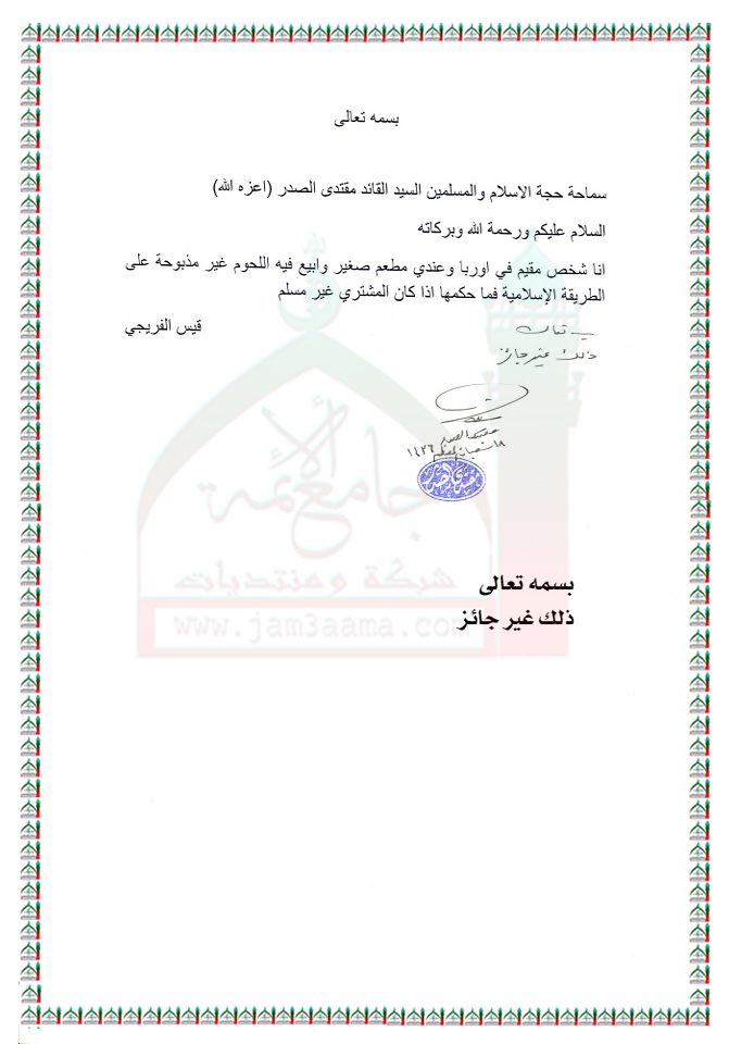 بيع اللحوم الغير مذبوحة على الطريقة الاسلامية استفتاء سماحة السيد القائد مقتدى الصدر ( اعزه الله ) 6 - 6 - 2015