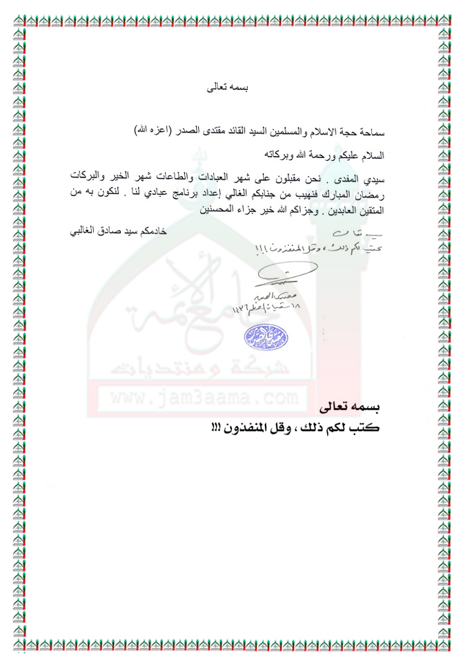 سائل يطلب اعداد برنامج عبادي لتطبيقه خلال شهر رمضان المبارك استفتاء سماحة السيد القائد مقتدى الصدر ( اعزه الله ) 6 - 6 - 2015