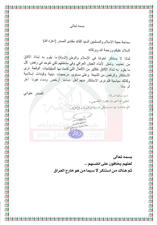 ردود الافعال من قبيل عدم الاستنكار والرفض بخصوص الجرائم التي يقترفها شذاذ الافاق استفتاء سماحة السيد القائد مقتدى الصدر ( اعزه الله ) 6 - 6 - 2015
