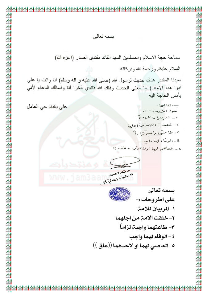 معنى الحديث النبوي الشريف (يا علي أنا وأنت أبوا هذه الأمة) استفتاء سماحة السيد القائد مقتدى الصدر ( اعزه الله ) 7 - 6 - 2015