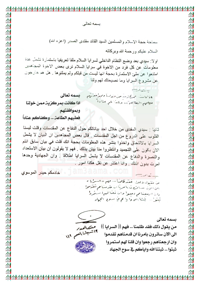 استمارة التعريف الخاصة بسرايا السلام و أمر سماحته لمجاهدي السرايا بنصرة العراق والدفاع عن المقدسات استفتاء سماحة السيد القائد مقتدى الصدر ( اعزه الله ) 7 - 6 - 2015