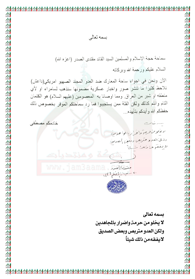 عدم التكتم من قبل البعض في نشر اخبار وصور تحركات المجاهدين في ساحات المعركة استفتاء سماحة السيد القائد مقتدى الصدر ( اعزه الله ) 8 - 6 - 2015