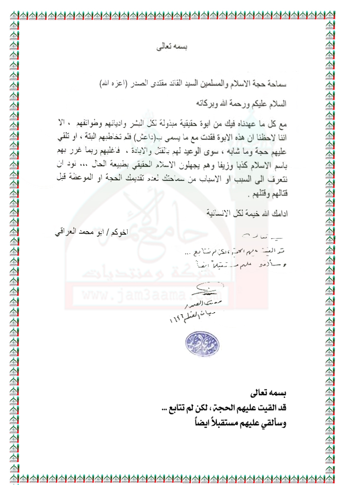 القاء الحجة على ما يسمى ب(داعش) قبل قتالهم وقتلهم استفتاء سماحة السيد القائد مقتدى الصدر ( اعزه الله ) 9 - 6 - 2015