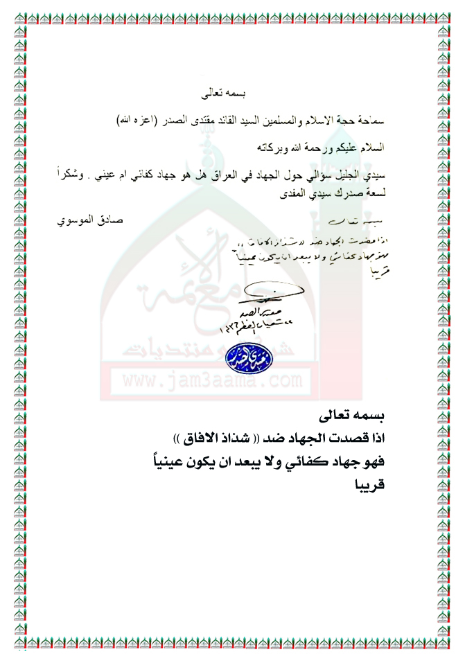 الجهاد ضد (شذاذ الآفاق) هو جهاد كفائي ولا يبعد ان يكون عينياً قريبا استفتاء السيد القائد مقتدى الصدر اعزه الله 10 - 6 - 2015