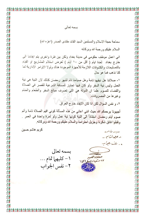 حكم الصوم للموظف اثناء الايفاد استفتاء السيد القائد مقتدى الصدر اعزه الله 11 - 6 - 2015