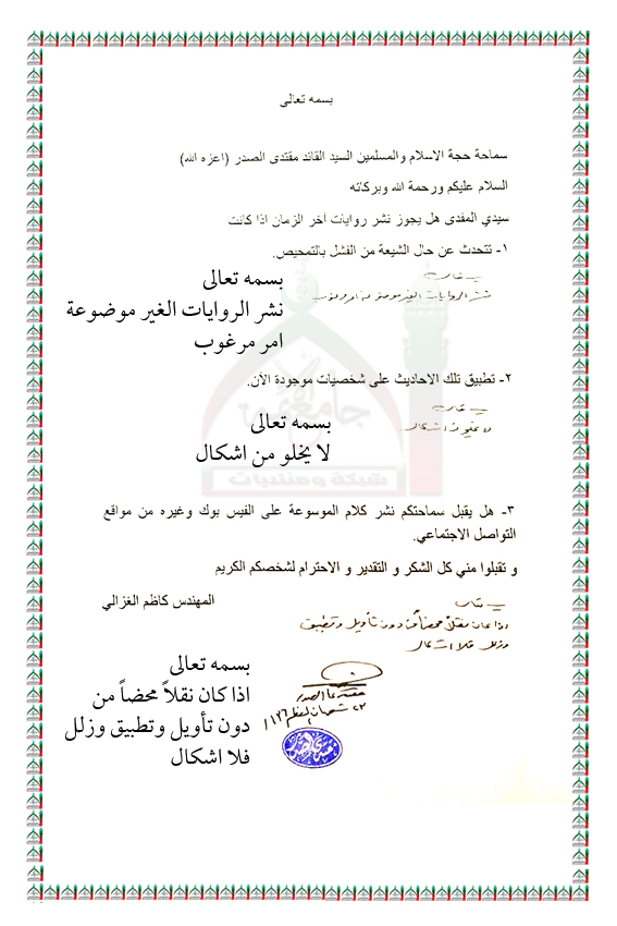 مجموعة من الاسئلة تخص نشر الروايات وموسوعة الامام المهدي عج استفتاء السيد القائد مقتدى الصدر اعزه الله 11 - 6 - 2015