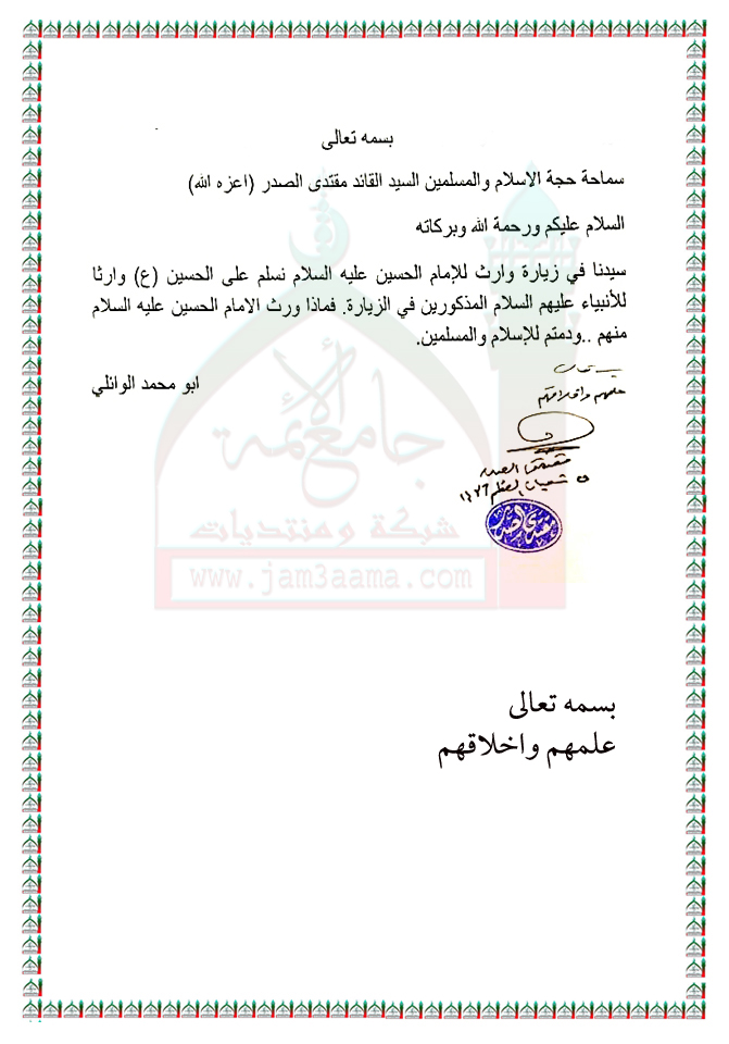 معنى ان الامام الحسين عليه السلام وارث الانبياء استفتاء السيد القائد مقتدى الصدر اعزه الله 13 - 6 - 2015