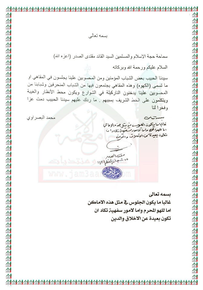 الجلوس في المقاهي والأماكن التي يجتمع فيها بعض الشباب المنحرف استفتاء سماحة السيد القائد مقتدى الصدر ( اعزه الله ) 13 - 6 - 2015