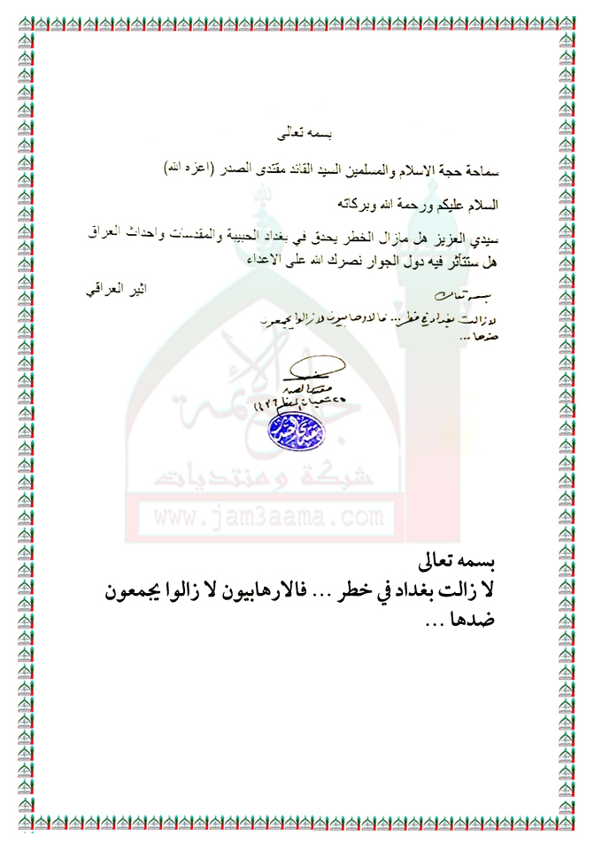 الخطر المحدق ببغداد: لا زالت بغداد في خطر ، فالارهابيون لازالوا يجمعون ضدها استفتاء السيد القائد مقتدى الصدر اعزه الله 13 - 6 - 2015