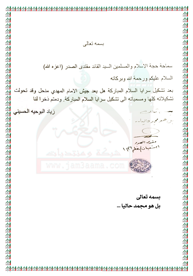 تحول جيش الامام المهدي(عج) الى تشكيلات سرايا السلام استفتاء سماحة السيد القائد مقتدى الصدر ( اعزه الله ) 14 - 6 - 2015
