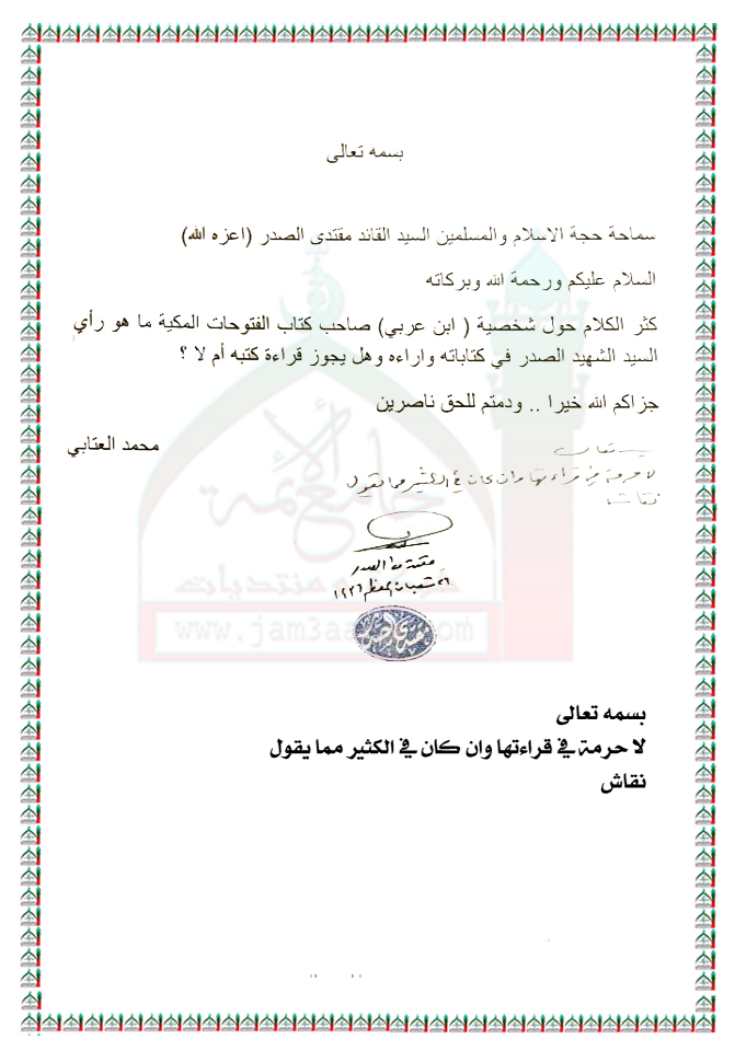 قراءة كتب ابن عربي استفتاء سماحة السيد القائد مقتدى الصدر ( اعزه الله ) 14 - 6 - 2015