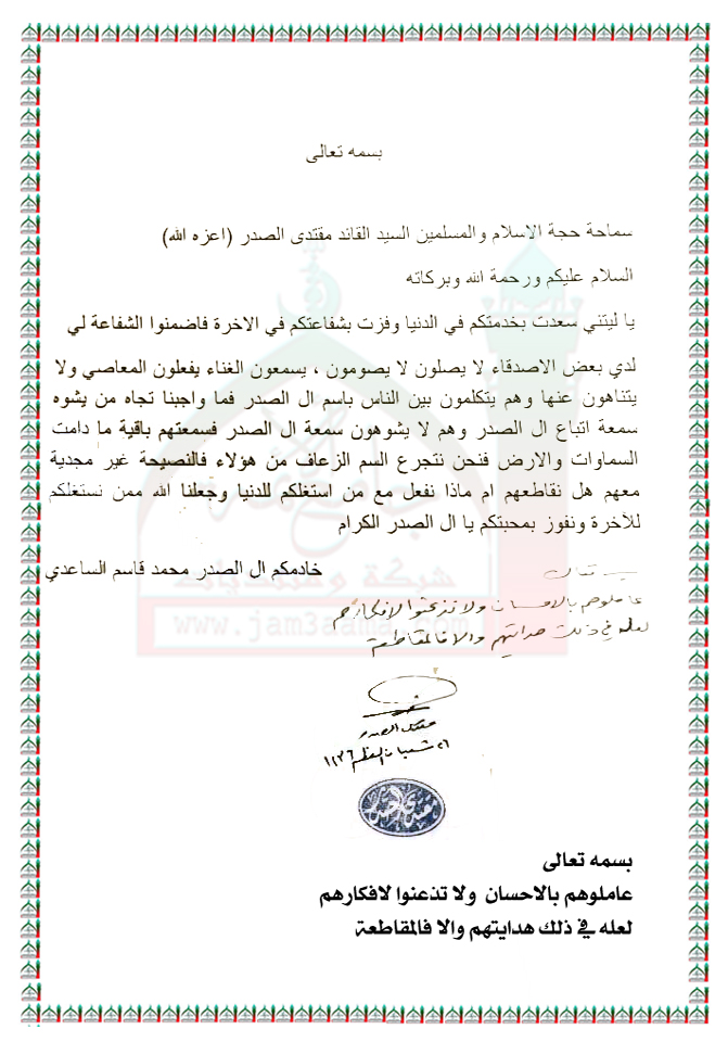 كيفية التعامل مع الاصدقاء الذين لا يصلون ولا يصومون ويسمعون الغناء استفتاء سماحة السيد القائد مقتدى الصدر ( اعزه الله ) 14 - 6 - 2015