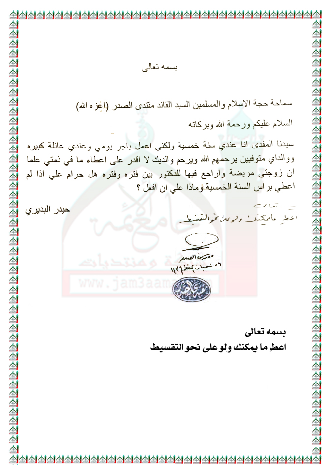اجير يومي لا يقدر على اعطاء ما في ذمته من الخمس استفتاء سماحة السيد القائد مقتدى الصدر ( اعزه الله ) 14 - 6 - 2015