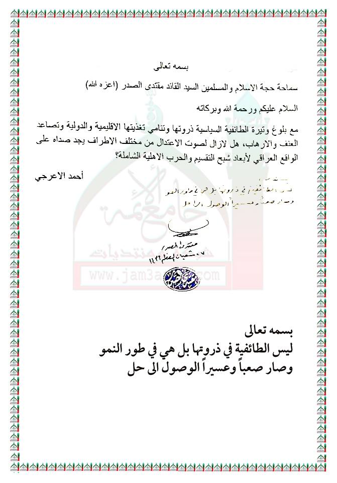 تنامي ظاهرة الطائفية السياسية وصعوبة الوصول الى حل لتلك الظاهرة استفتاء السيد القائد مقتدى الصدر اعزه الله 15 - 6 - 2015