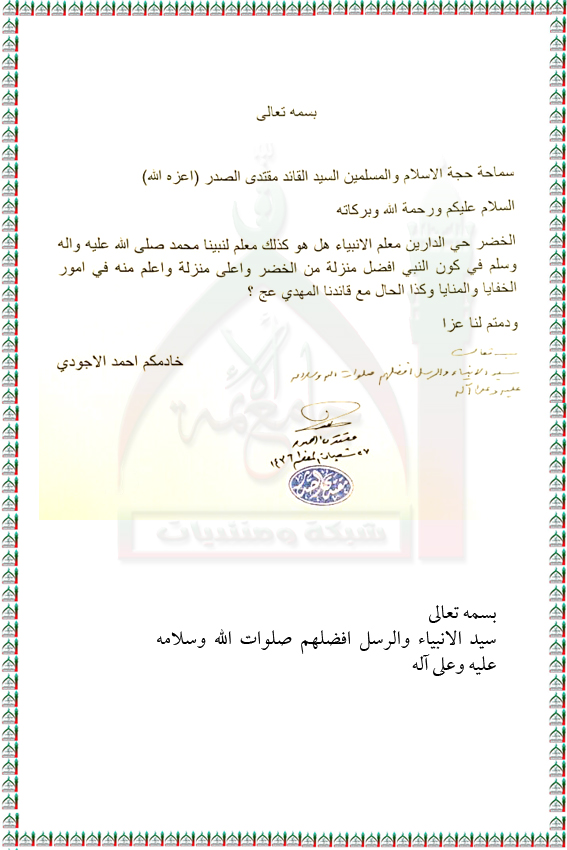 ايهما اعلى منزلة النبي الاكرم محمد صلى الله عليه واله ام الخضر عليه السلام استفتاء السيد القائد مقتدى الصدر اعزه الله 15 - 6 - 2015