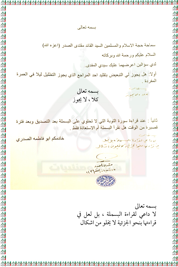 التبعيض في التقليد وقراءة سورة التوبة استفتاء السيد القائد مقتدى الصدر اعزه الله 15 - 6 - 2015