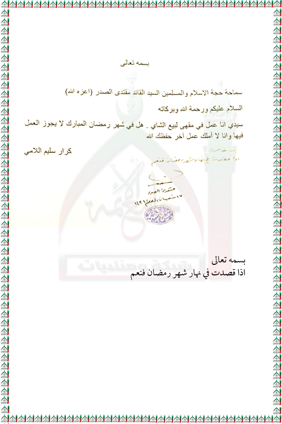 عمل احد الاشخاص في مقهى لبيع الشاي في شهر رمضان المبارك استفتاء السيد القائد مقتدى الصدر اعزه الله 15 - 6 - 2015