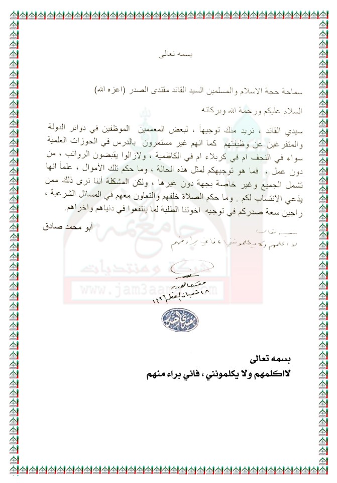 بعض المعممين الموظفين المفرغين والتاركين لدروسهم الحوزوية استفتاء سماحة السيد القائد مقتدى الصدر ( اعزه الله ) 16 - 6 - 2015