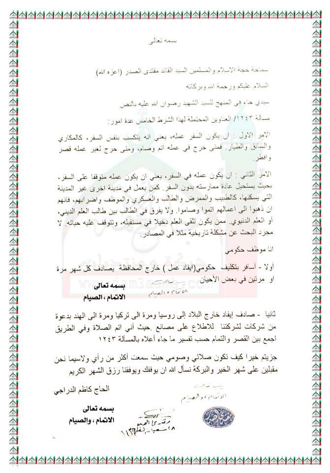 الصوم بالنسبة لموظف يكلف بالسفر داخل وخارج البلد من قبل دائرته استفتاء سماحة السيد القائد مقتدى الصدر ( اعزه الله ) 16 - 6 - 2015