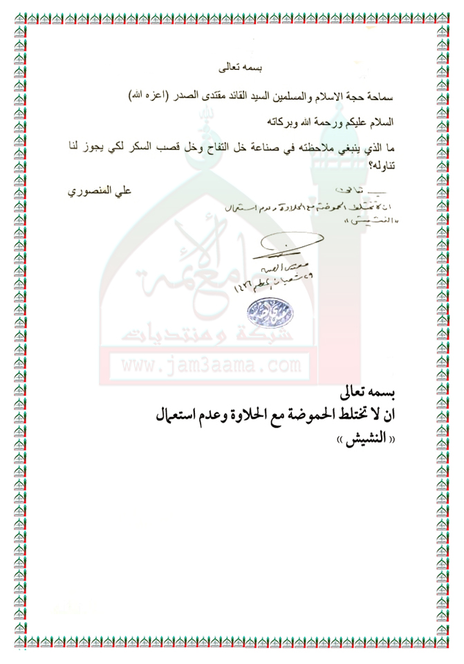 صناعة خل التفاح وخل قصب السكر استفتاء السيد القائد مقتدى الصدر اعزه الله 17 - 6 - 2015
