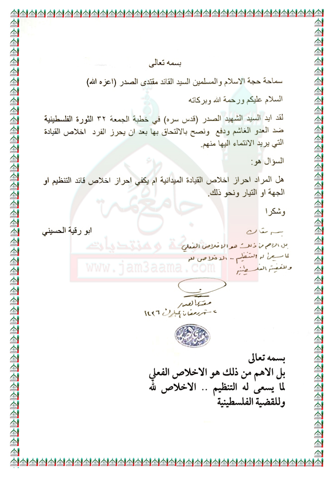 ما ذكر في احدى خطب صلاة الجمعة للسيد الشهيد محمد الصدر ( قدس) بخصوص الثورة الفلسطينية استفتاء السيد القائد مقتدى الصدر اعزه الله 19 - 6 - 2015