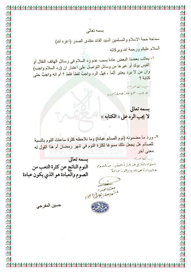رد السلام في مواقع التواصل الاجتماعي والنوم بالنسبة للصائم استفتاء السيد القائد مقتدى الصدر اعزه الله 21 - 6 - 2015