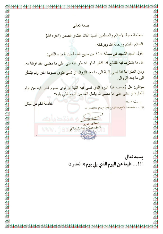 ما ذكر في مسألة ١١٥ في منهج الصالحين استفتاء السيد القائد مقتدى الصدر اعزه الله 21 - 6 - 2015