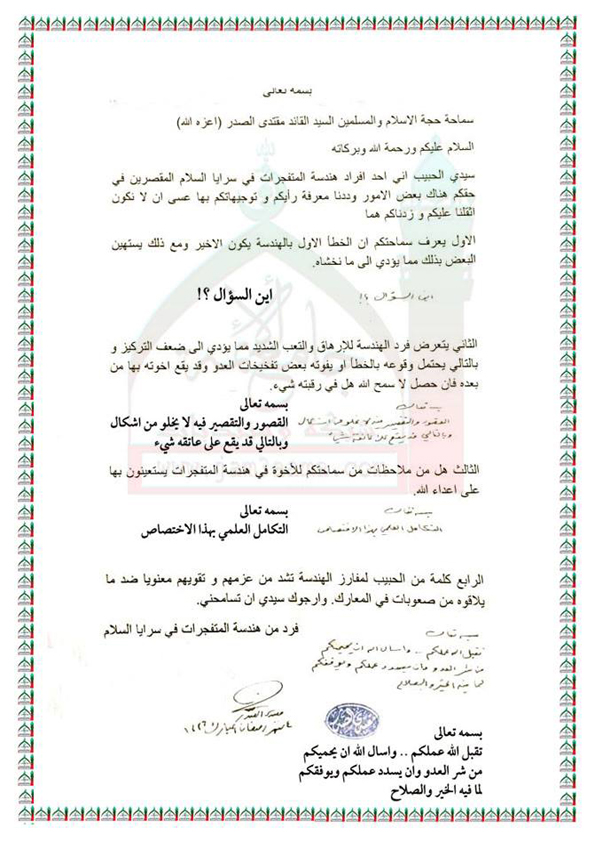 مجموعة اسئلة قدمت لسماحته من احد افراد هندسة المتفجرات في سرايا السلام استفتاء السيد القائد مقتدى الصدر (اعزه الله) 21 - 6 - 2015