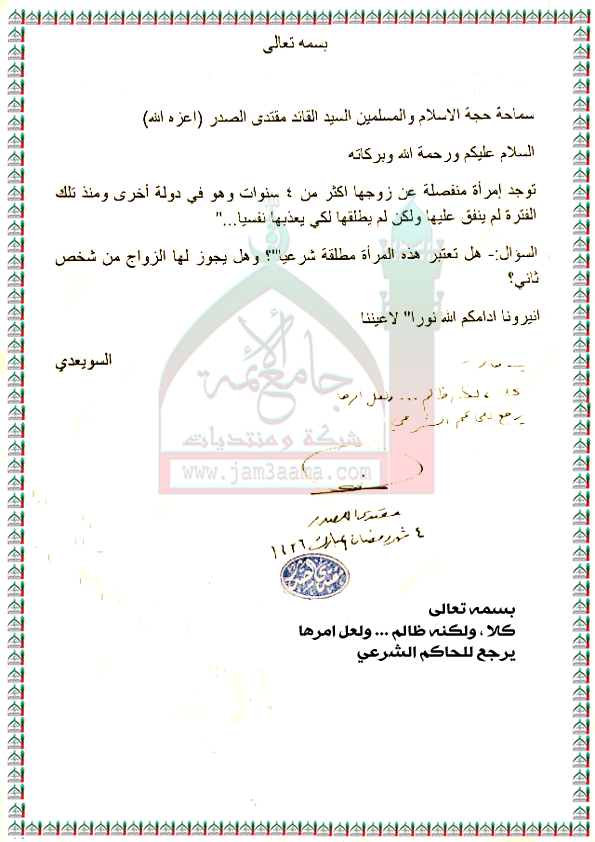 الطلاق الشرعي لامرأة منفصلة عن زوجها اكثر من اربع سنوات استفتاء السيد القائد مقتدى الصدر (اعزه الله) 21 - 6 - 2015