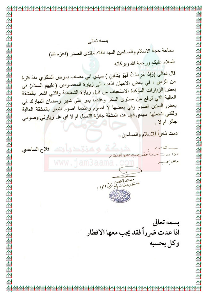 صيام احد الاشخاص مصاب بمرض السكر استفتاء السيد القائد مقتدى الصدر اعزه الله 22 - 6 - 2015