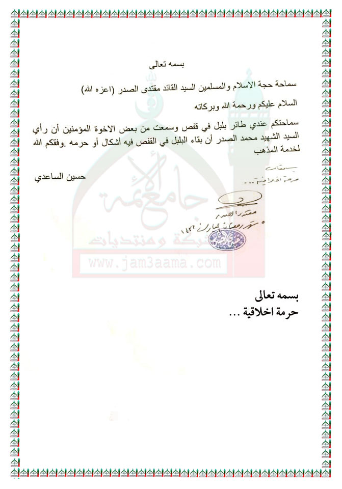 وضع طائر البلبل في قفص استفتاء السيد القائد مقتدى الصدر اعزه الله 22 - 6 - 2015