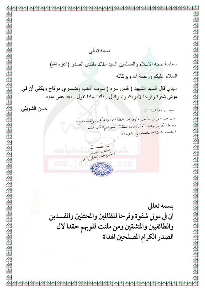 ان في موتي شفوة وفرحاً للظالمين والمحتلين والمفسدين والطائفيين والمنشقين ومن ملئت قلوبهم حقداً لال الصدر الكرام المصلحين الهداة استفتاء السيد القائد مقتدى الصدر اعزه الله 23 - 6 - 2015