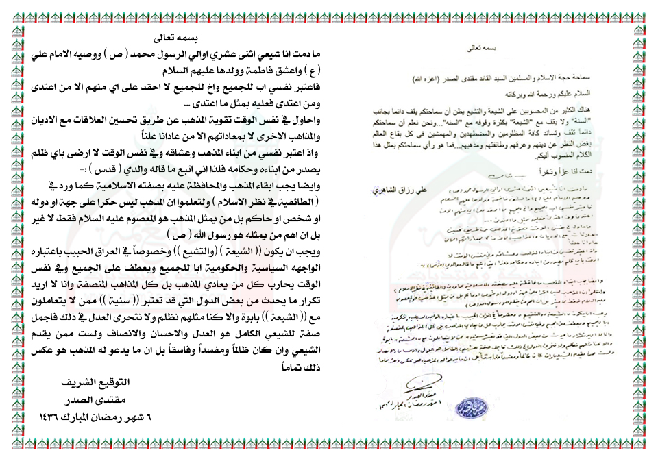 وقوف سماحته مع المظلومين والمضطهدين بغض النظر عن دينهم وعرقهم ومذهبهم استفتاء سماحة السيد القائد مقتدى الصدر ( اعزه الله ) 23 - 6 - 2015